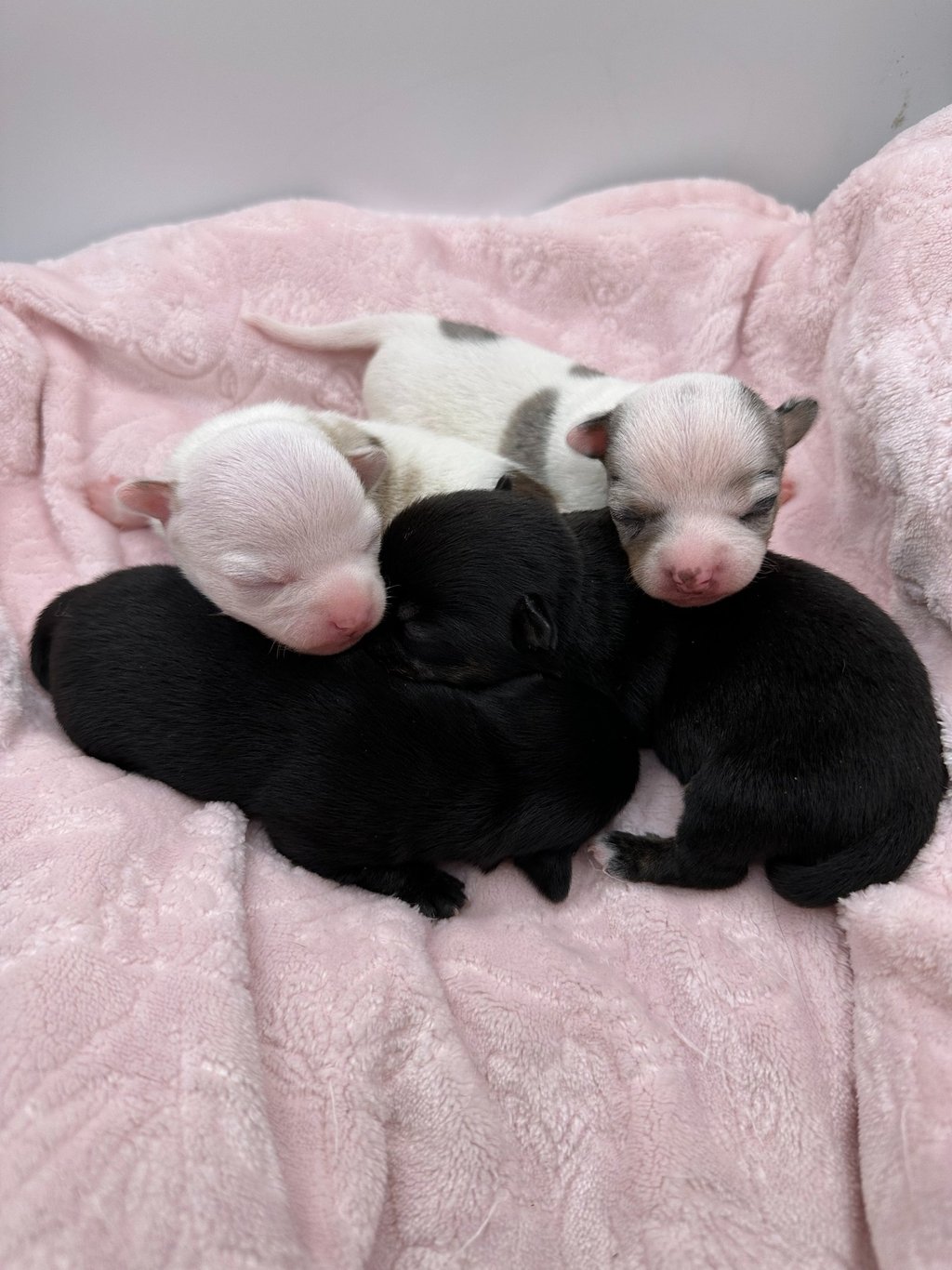 We have two gorgeous male merle spotted on white pups available. Obe chocolate and one blue. Absolutely stunning! And two black with white markings and brindling on their legs. Typically the brindling on their bodies comes in at around 6-9 weeks.